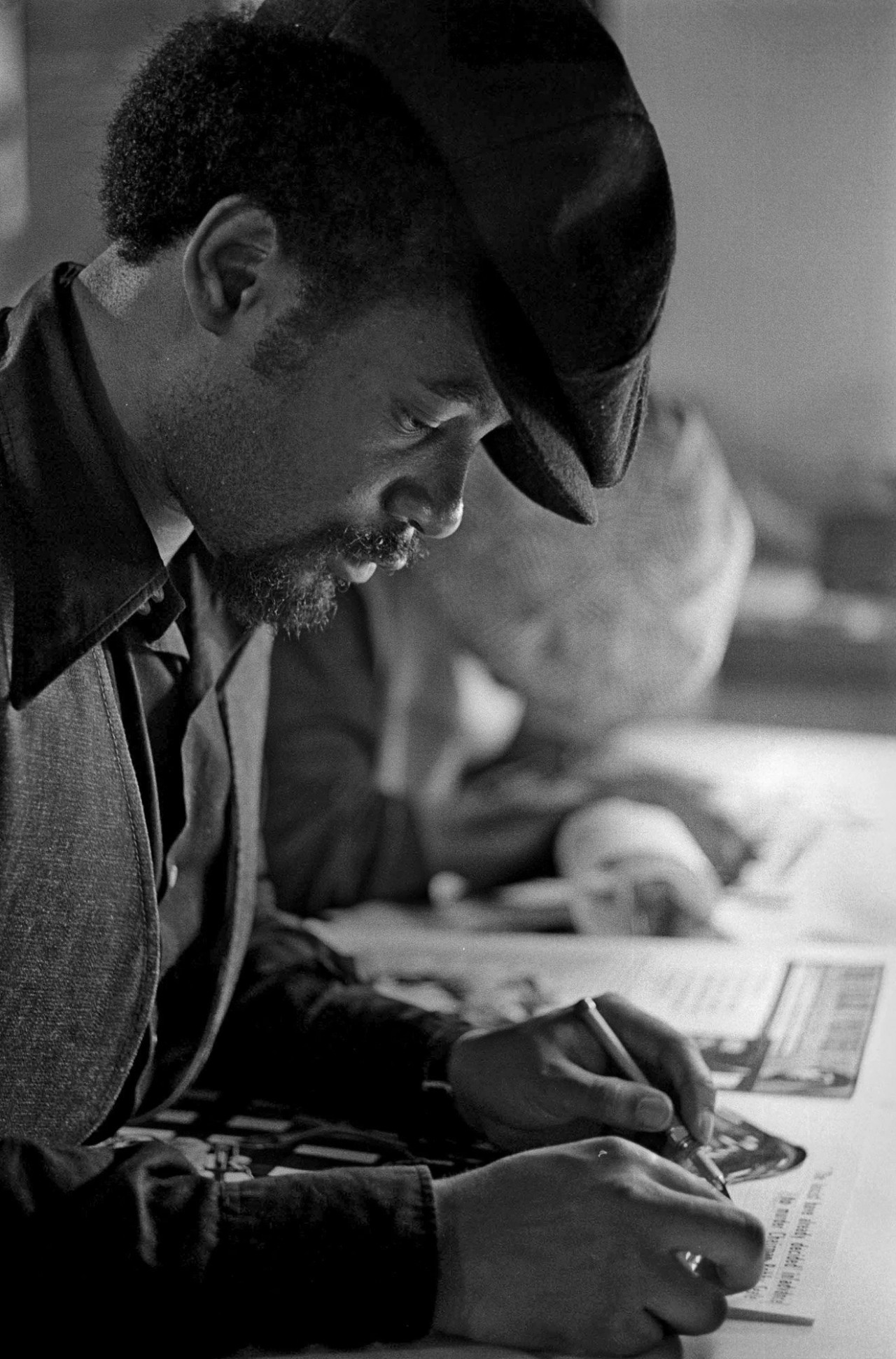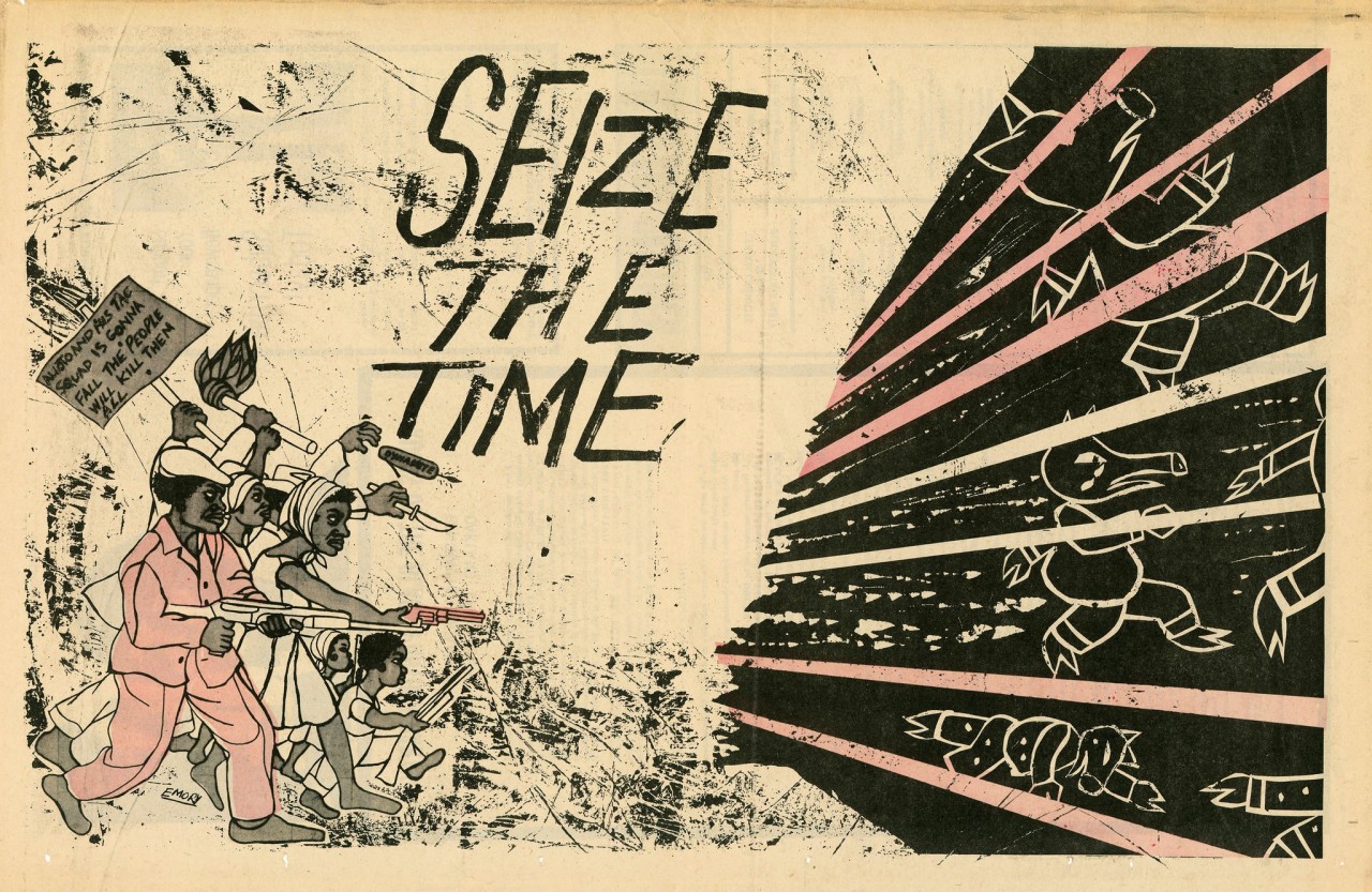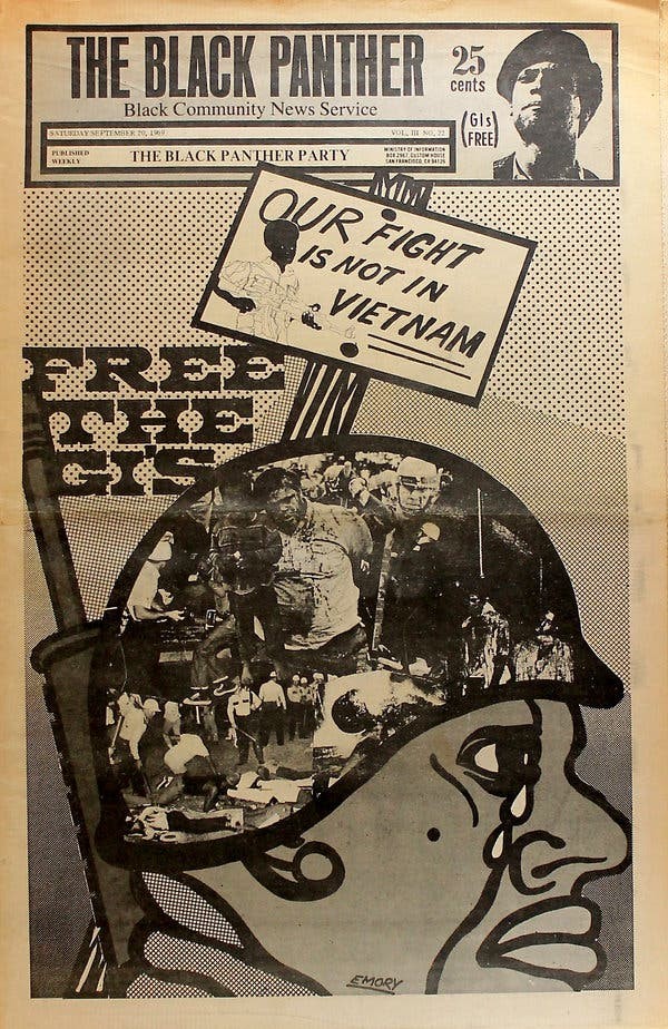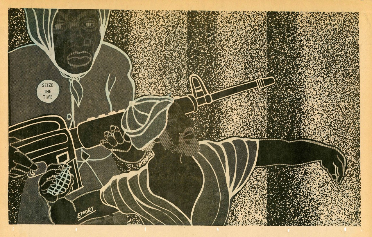 At civil rights activist Eldridge Cleaver's apartment, where Seale was working on the inaugural issue of The Black Panther, Douglas offered his design skills. He realized The Black Panther needed potent images to cut through the high illiteracy rates in poor communities.